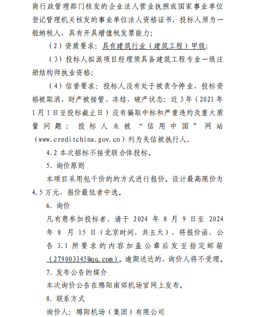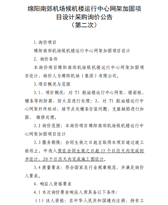 綿陽(yáng)南郊機(jī)場(chǎng)候機(jī)樓運(yùn)行中心網(wǎng)架加固項(xiàng)目設(shè)計(jì)采購(gòu)詢(xún)價(jià)公告(第二次)