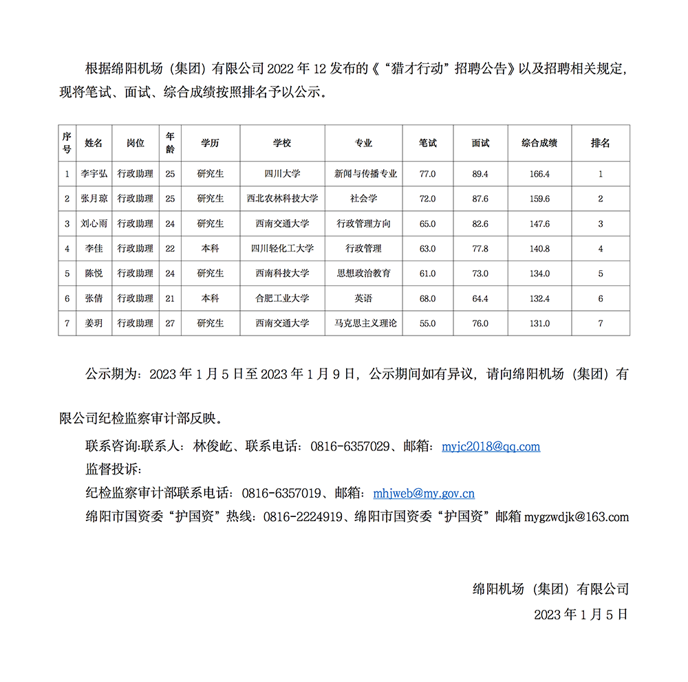綿陽機(jī)場(chǎng)(集團(tuán))有限公司 2022年“獵才行動(dòng)”招聘綜合成績(jī)公示